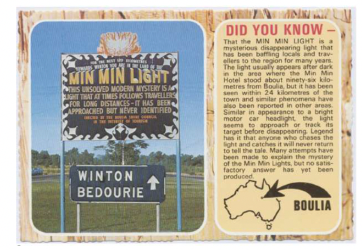 For the practical execution of the project, I’ll visit local archives and travel to the region where this phenomenon was observed. I’m particularly interested in exploring the town of Boulia, and visit the Min Min Encounter Museum.
